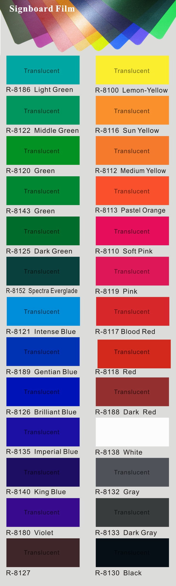產品特點:色彩鮮艷、透光性好、品質優異、性能穩定,有極好的戶外耐候性。 應用范圍:廣告招牌燈箱,店面裝飾,指示牌,櫥窗裝飾。