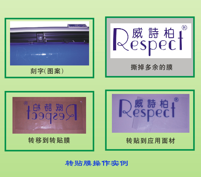 只需將轉(zhuǎn)貼膜在切割好的圖案或文字上面一貼就能全部將圖案文字輕輕松松轉(zhuǎn)過來,然后再貼到您要貼的地方就好了,非常方便。根據(jù)粘合力和基材的不同,有粘度及尺寸規(guī)格選擇